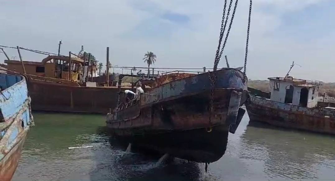 وزنه 45 طناً.. الموانئ تنتشل زورقاً غارقاً من مياه شط العرب